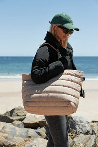 Stuff, zip and go. A soft-as-a-cloud shoulder bag for days on the go or weekends away. The take it base is your stylish sidekick with its bold, padded fabric and generously sized design. Take it from morning Pilates to an in-office day and a short weekend getaway.