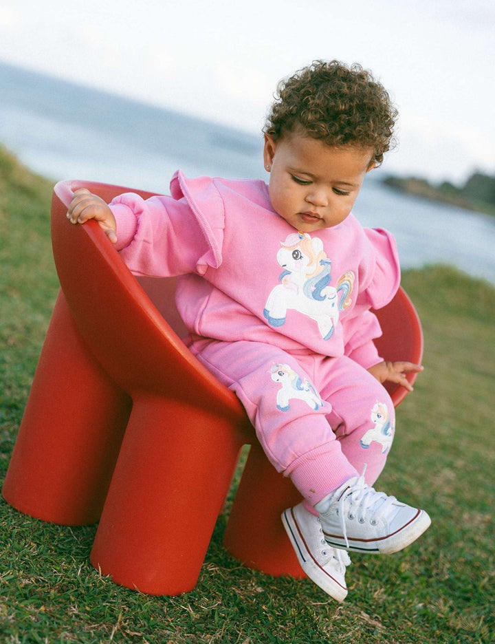 Proof unicorns do exist. At least at Hux, and in little imaginations. Made from fluffy organic cotton terry, these track pants feature a functional drawstring for an adjustable fit, a sparkly unicorn embroidery knee detail and a soft, stretchy waistband to keep little tummies snug. Made for all day play.